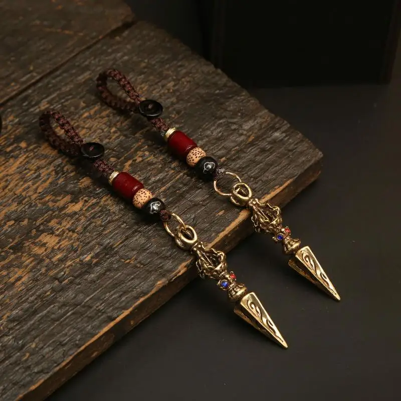 Portachiavi Vajra vintage fatto a mano da uomo, ciondolo amuleto diamantato, portachiavi per auto in ottone buddista tibetano con corda annodata