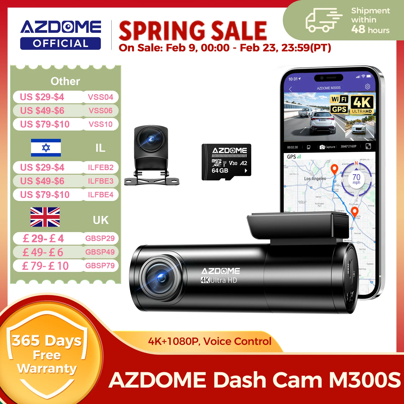 AZDOME M300S Dash Cam 4K+1080P Telecamera per Auto con Obiettivo 800MP, GPS Integrato, WIFI, Controllo Vocale e Visione Notturna