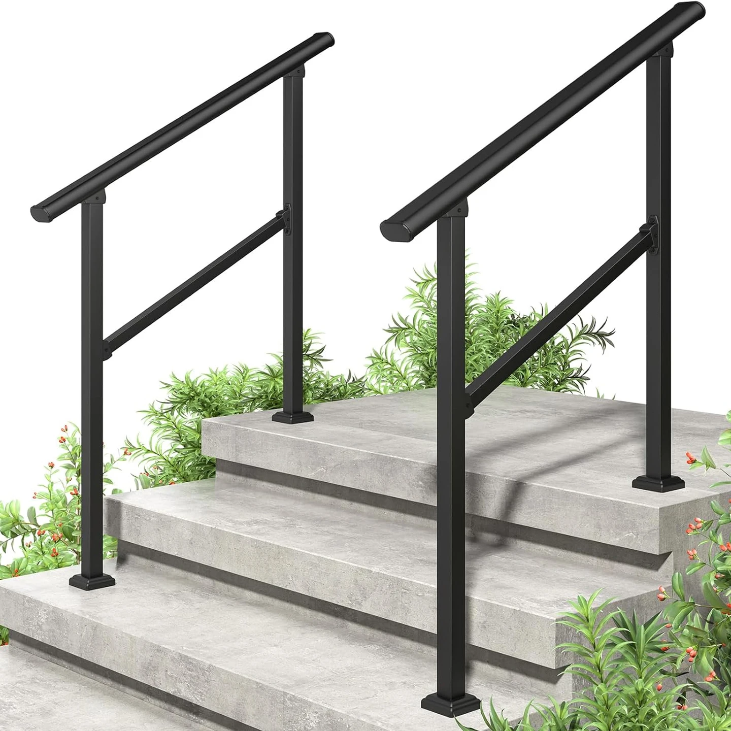 Corrimano per esterni per gradini, kit ringhiera a 2 gradini, tubo quadrato nero con barra orizzontale, ringhiere di supporto in acciaio al carbonio per anziani