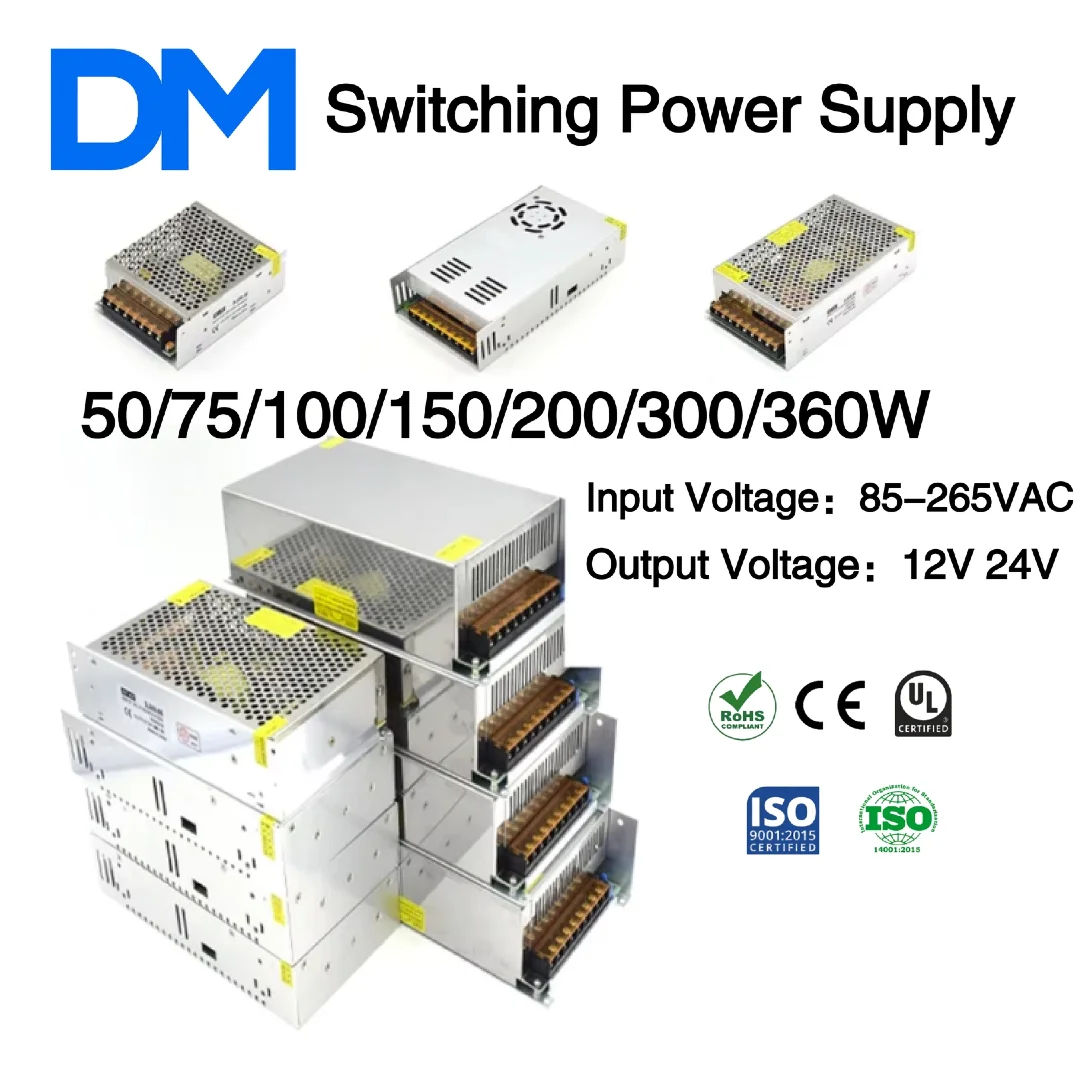 Alimentatore Switching 50W/75W/100W/150W/200W/300W/360W per Strisce LED, da AC 85-265V a DC 12V/24V