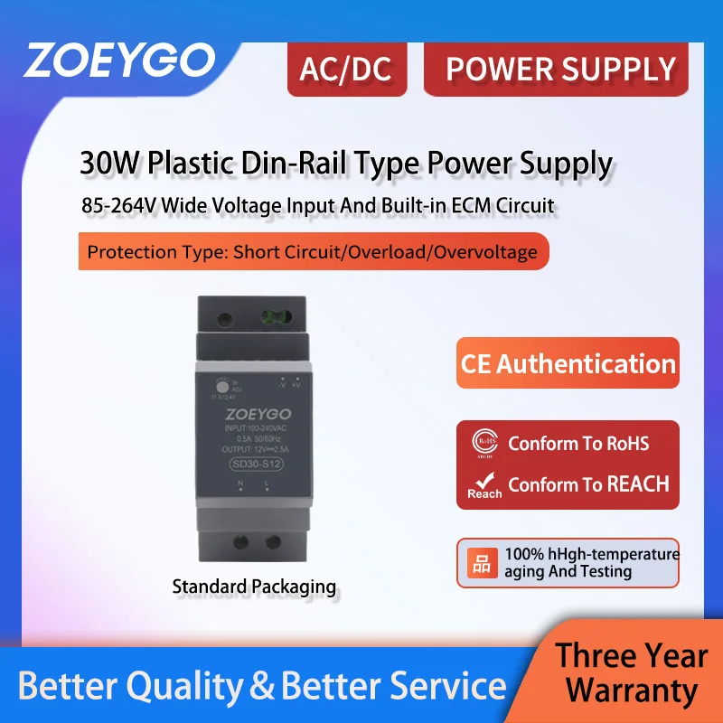 ZOEYGO Alimentatore con interruttore su guida DIN da 30 W, tensione di isolamento da 3000 V Trasformatore 5 V/12 V/15 V/24 V/3 A, alimentatore su guida DIN