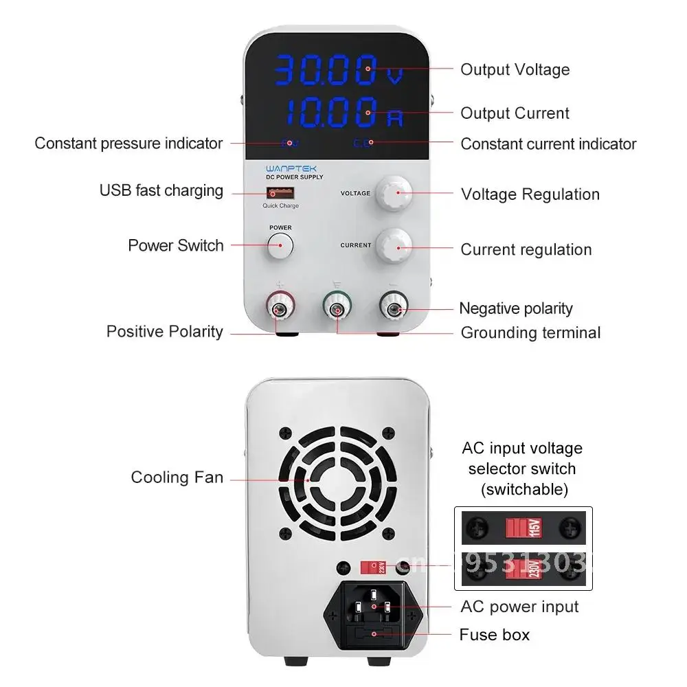 Wanptek Alimentatore CC regolabile 30V 10A 60V 5A 120V Alimentazione Regolatore da laboratorio Sorgente 220V Alimentazione 110V Interruttore stabilizzato in tensione 3A