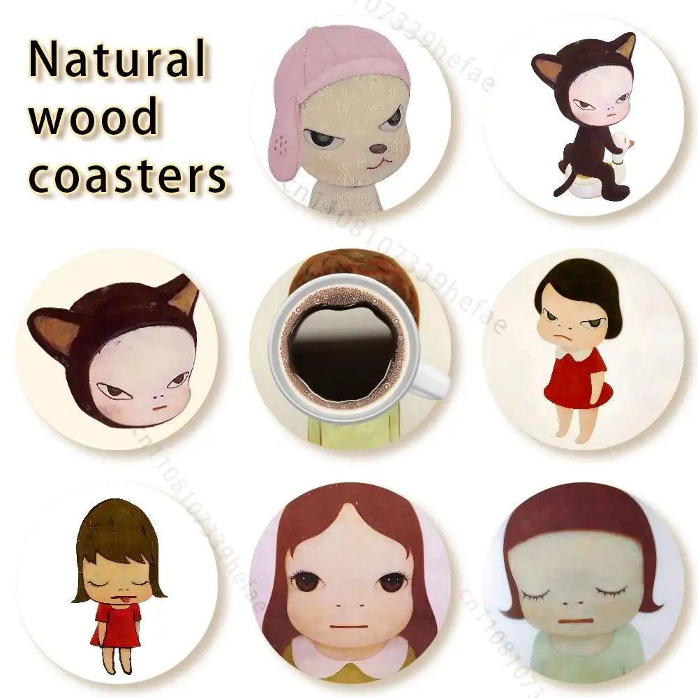 Simpatici Sottobicchieri in Legno Stile Vintage Y-Yoshitomo N-Nara 4 Pollici per Tazze di Caffè e Tè Decorazione Casa Regalo per Natale e Capodanno