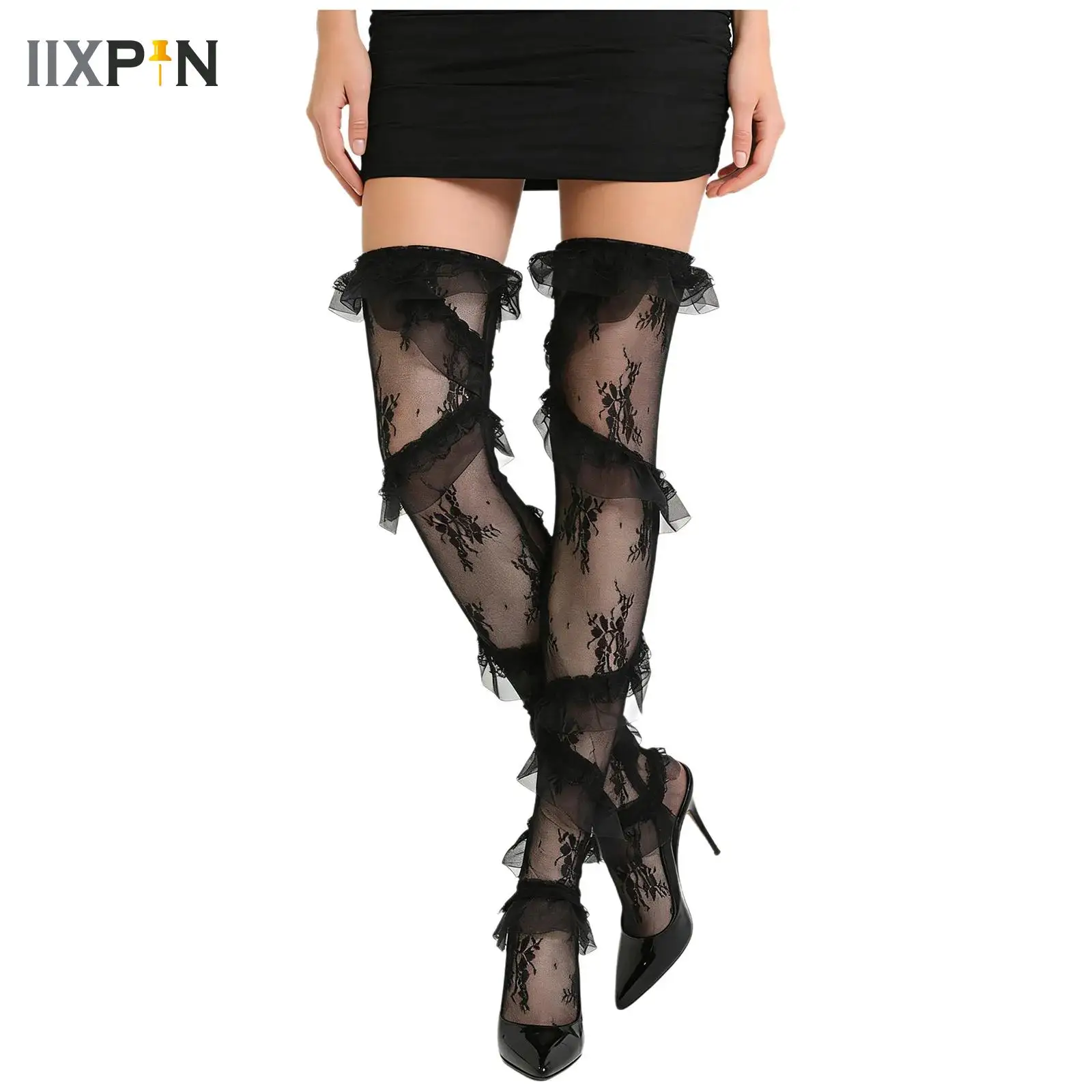 1 Paio di Calze da Donna, Nuova Moda Primaverile, con Volant e Patchwork, Calze Lunghe al Ginocchio in Pizzo, Stile Harajuku Streetwear, Calze a Rete