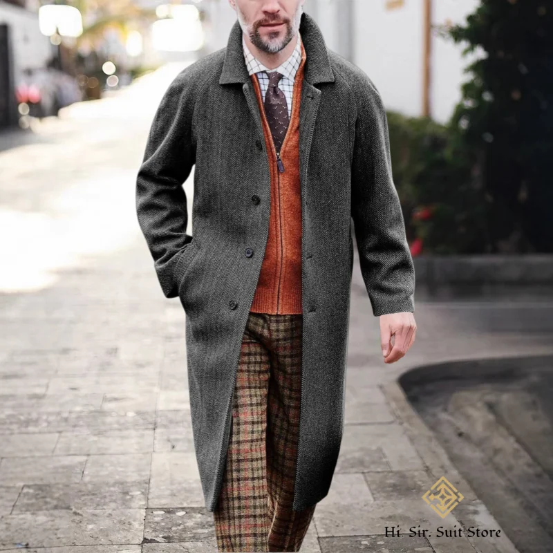 Trench lungo da uomo retrò Giacche a spina di pesce Tweed Slim Fit Prom Peacoat Giacca in misto lana Cappotti Giacca invernale da uomo casual