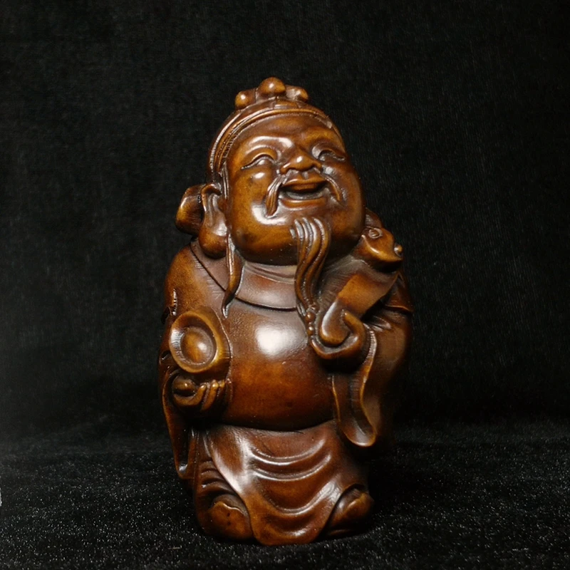 Statua Antica del 1919 in Legno di Bosso Cinese Intagliata a Mano, Dimensioni 8.2×4.5 cm, Raffigurante un Borsaio, Dio della Ricchezza, Decorazione da Tavolo
