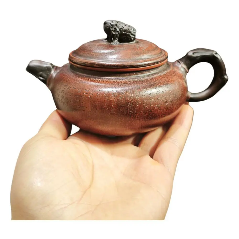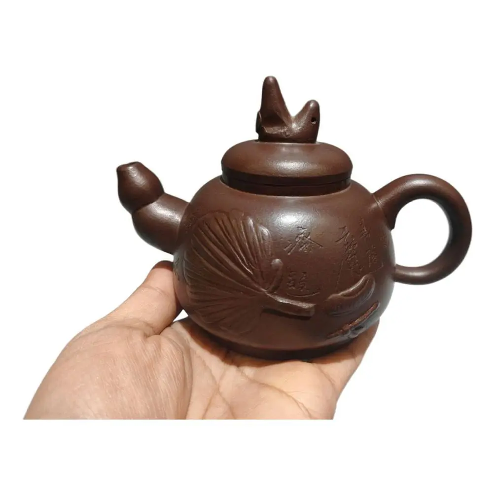 Yixing Teiera in argilla viola a spirale a mano Tè giallo sabbiato Set di stoviglie orientali inciso inciso intagliato artigiano rotondo rospo