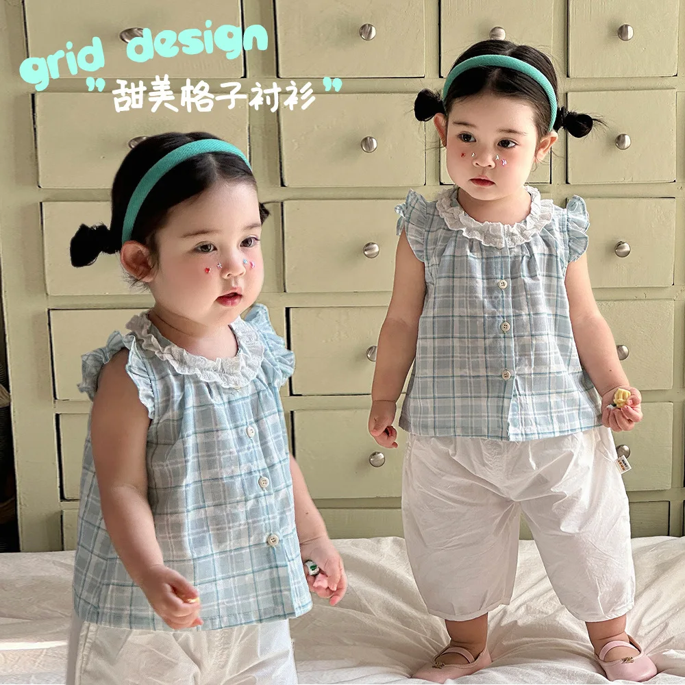 Nuova Camicia Estiva a Quadri per Bambine 2026, Top Senza Maniche con Maniche a Volant, Stile Coreano, Abbigliamento Casual Quotidiano per Bambini