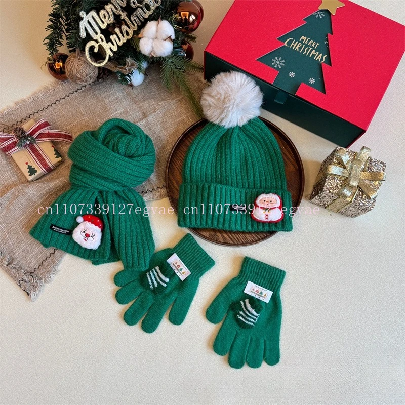 2026 Set invernale da 3 pezzi per bambini Sciarpa Cappello Guanti Abito caldo Tema natalizio Accessori per climi freddi rossi e verdi per bambini