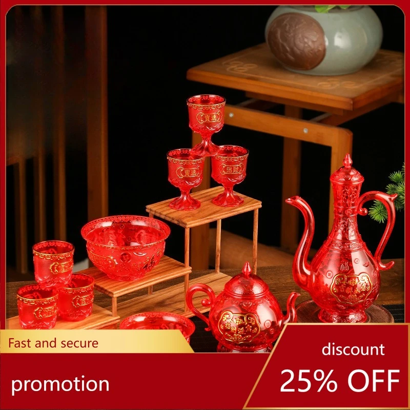 Set completo di piatti, tazze e ciotole per offerte sacre in plastica con stampa a caldo effetto cristallo, e teiera per vino.