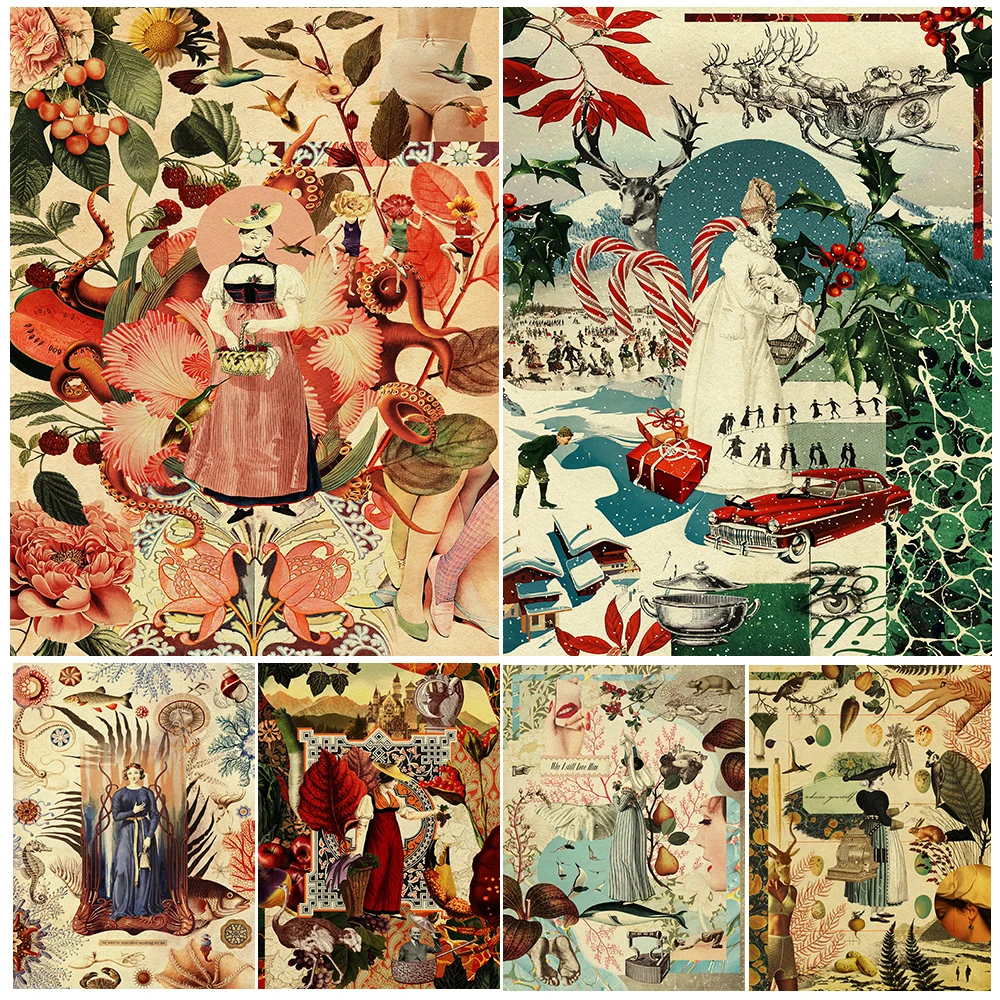 Collage astratto Vintage Wall Art Canvas Painting Ragazza che lavora Arte astratta, poster e stampa per la decorazione del soggiorno senza cornice
