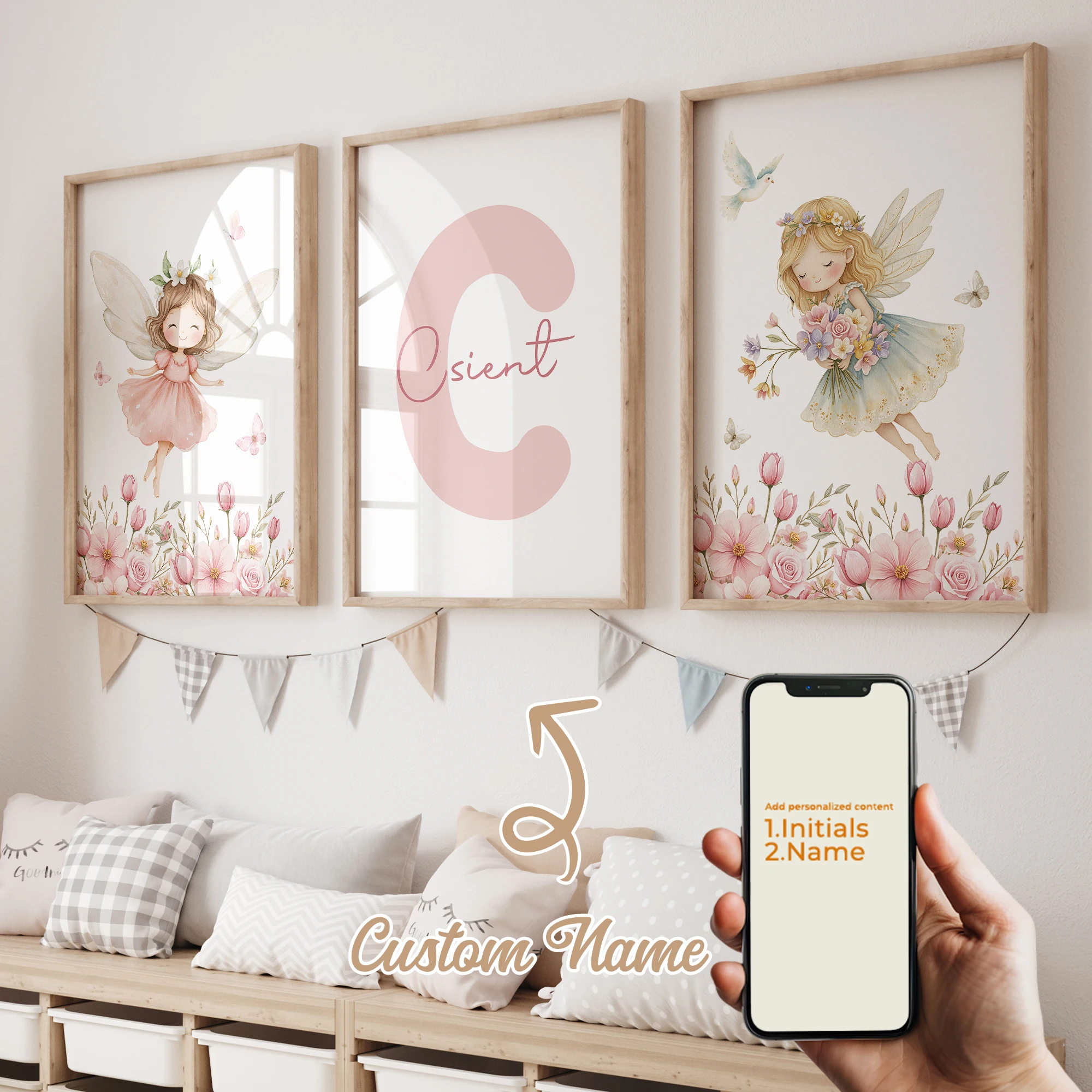 3 pezzi nome personalizzato personalizzato carino rosa elfo fiore farfalla uccello stampa artistica da parete immagine soggiorno camera dei bambini decorazioni per la casa