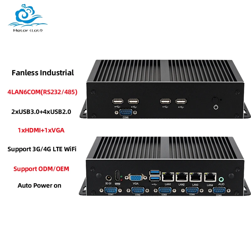 Mini PC Industriale con 4×LAN Gigabit, 6×COM RS232/485, HDMI1.4, 6xUSB, Linux, WiFi, Modulo 4G, Computer Industriale per Controllo Embedded