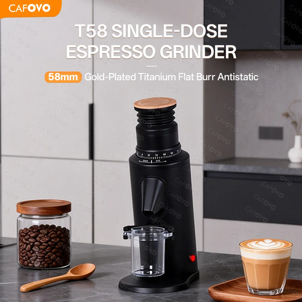 Macinacaffè Elettrico CAFOVO T58 a Dose Singola, Antistatico, con Macine Piatte in Titanio Placcato Oro da 58mm, per Baristi Domestici