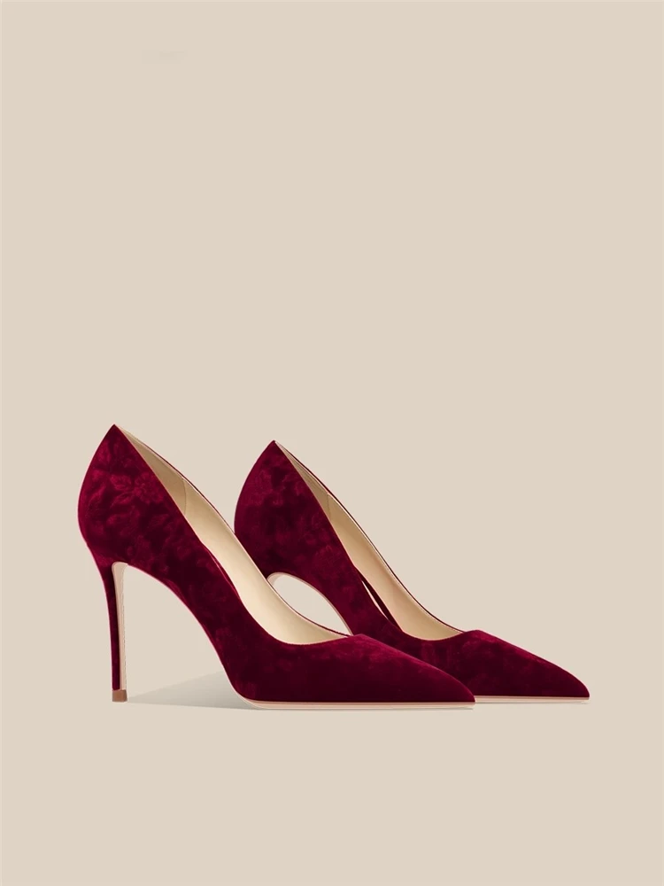 Tacchi a spillo autunno nuova luce a punta sorpa vino rosso scarpe stampate in pelle scamosciata abito da banchetto scarpe da donna con tacco basso di piccole dimensioni