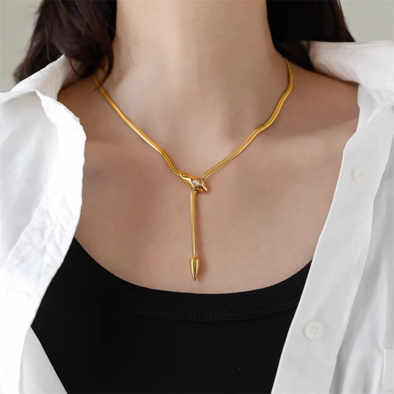 EILIECK Collana a forma di Y con pendente lungo a testa di serpente in metallo in acciaio inossidabile 316L per le donne Nuovi gioielli di moda con catena al collo a 2 colori