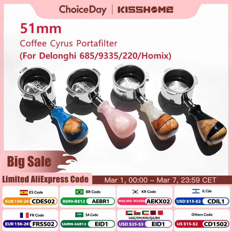 Caffè Portafiltro senza fondo 51mm Doppio beccuccio Cyrus Maniglia per Delonghi 685 9335 220 Homix Macchina per caffè espresso Accessori Strumenti