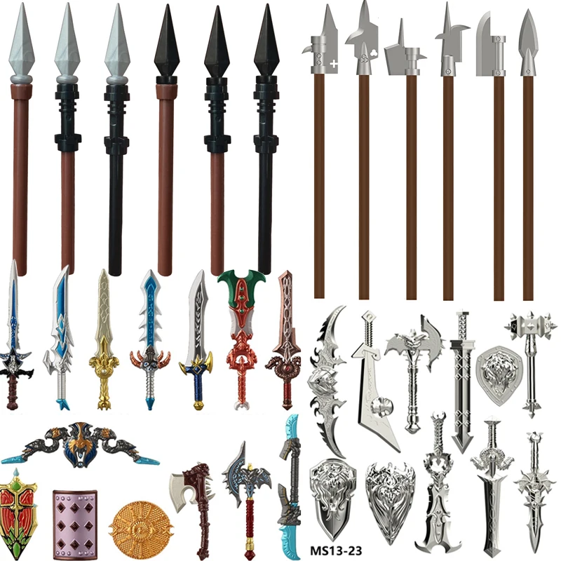MOC Building Blocks Guerra militare medievale Esercito Scudo Armi Abbigliamento Caschi Spada Lancia Mattoni Giocattoli Regali di compleanno