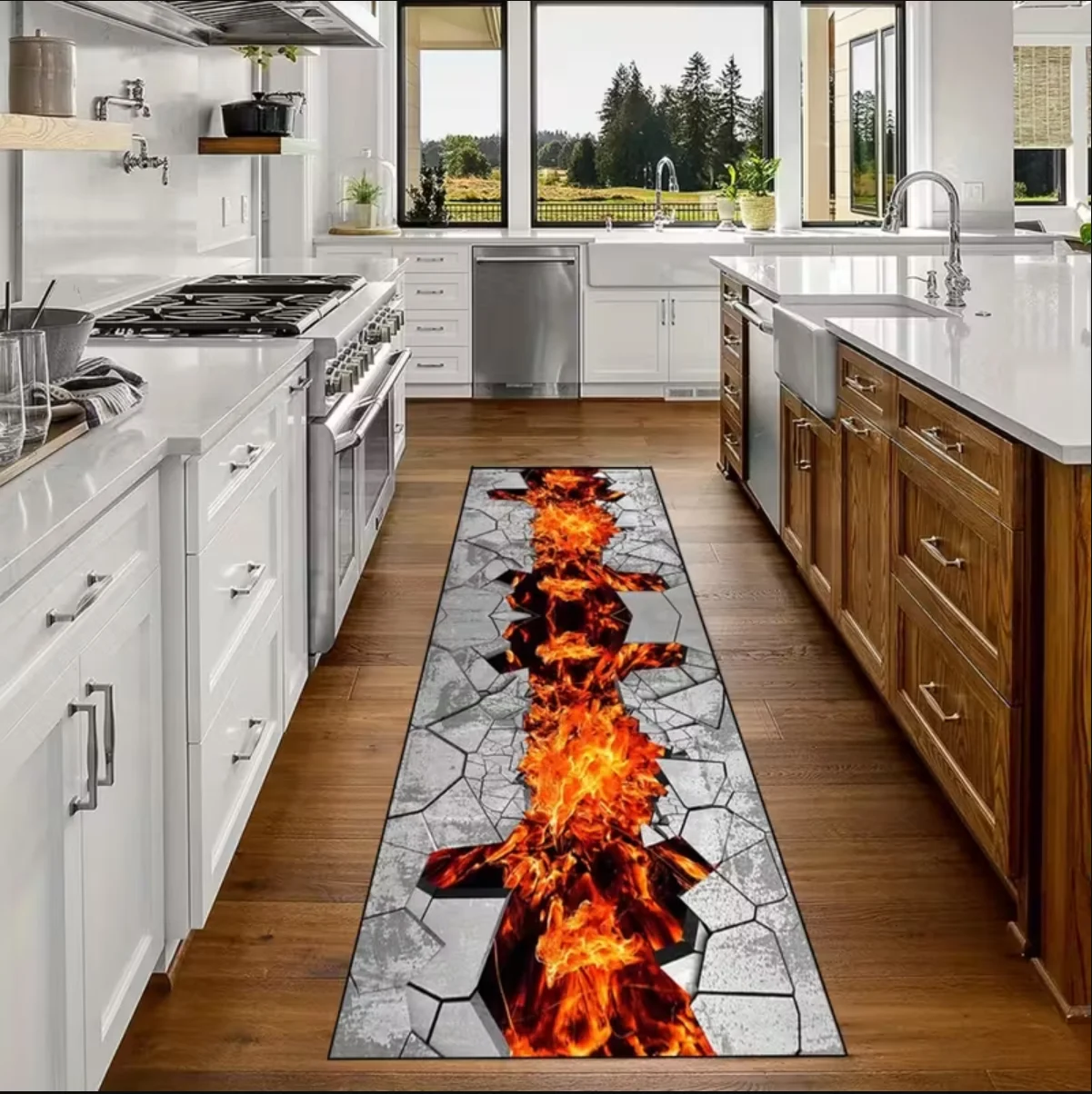 Tappeto da cucina con motivo 3D a fiamma vulcanica, antiscivolo, morbido, facile da pulire, resistente alle macchie, tappetino decorativo per corridoio