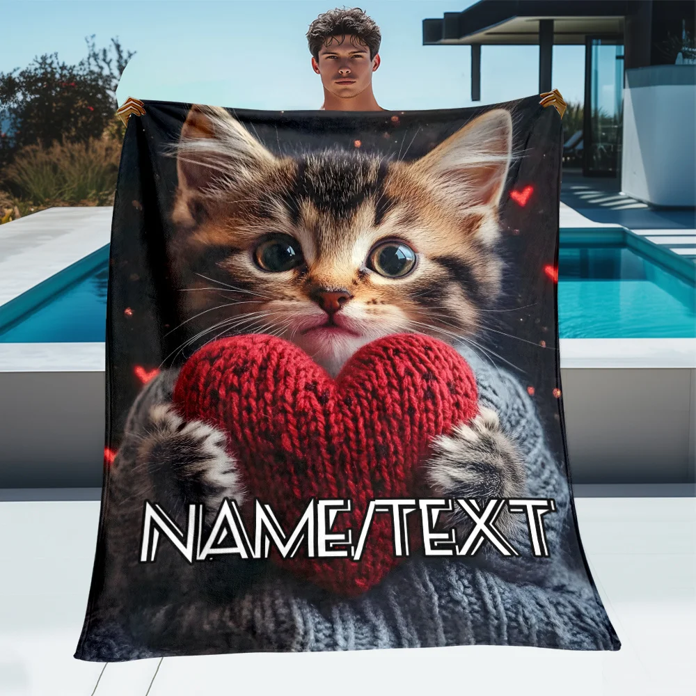 1 coperta in flanella con nome personalizzato Cat & Love – morbida e leggera con adorabile design a forma di gattino e cuore rosso