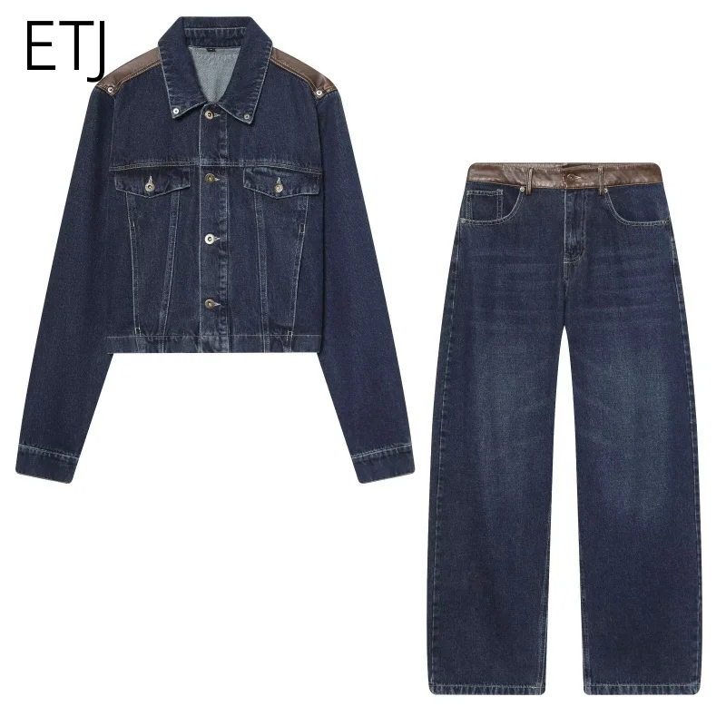 Completo Donna ETJ: Giacca in Denim e Jeans con Patch in Pelle, Pantaloni Oversize a Gamba Larga, Outfit Moda Due Pezzi 2026
