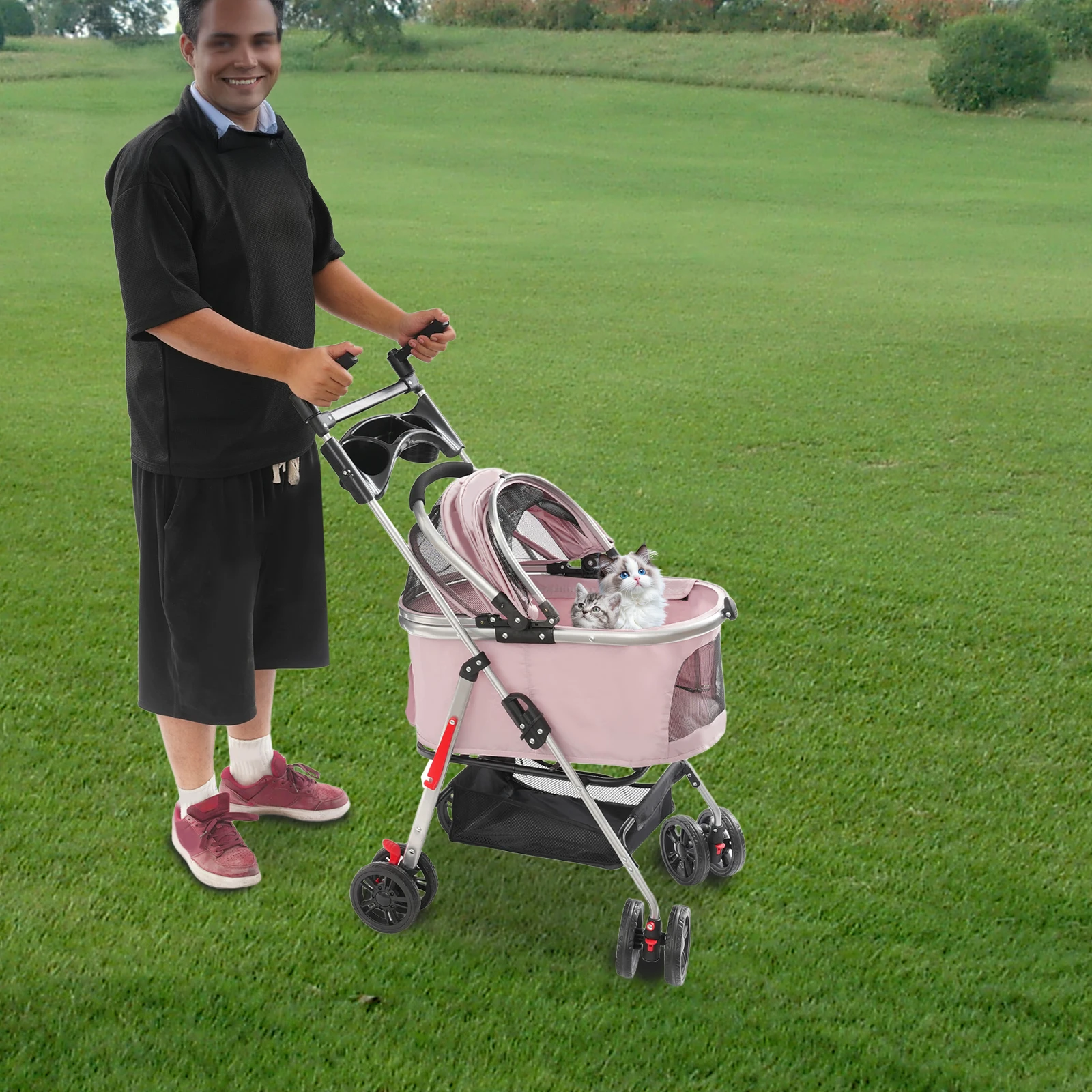 Carrello Pieghevole per Animali Domestici, Carrello Portaoggetti Staccabile con Ruote, Manico Regolabile, Cestino da Trasporto per Cani e Gatti di Piccola Taglia