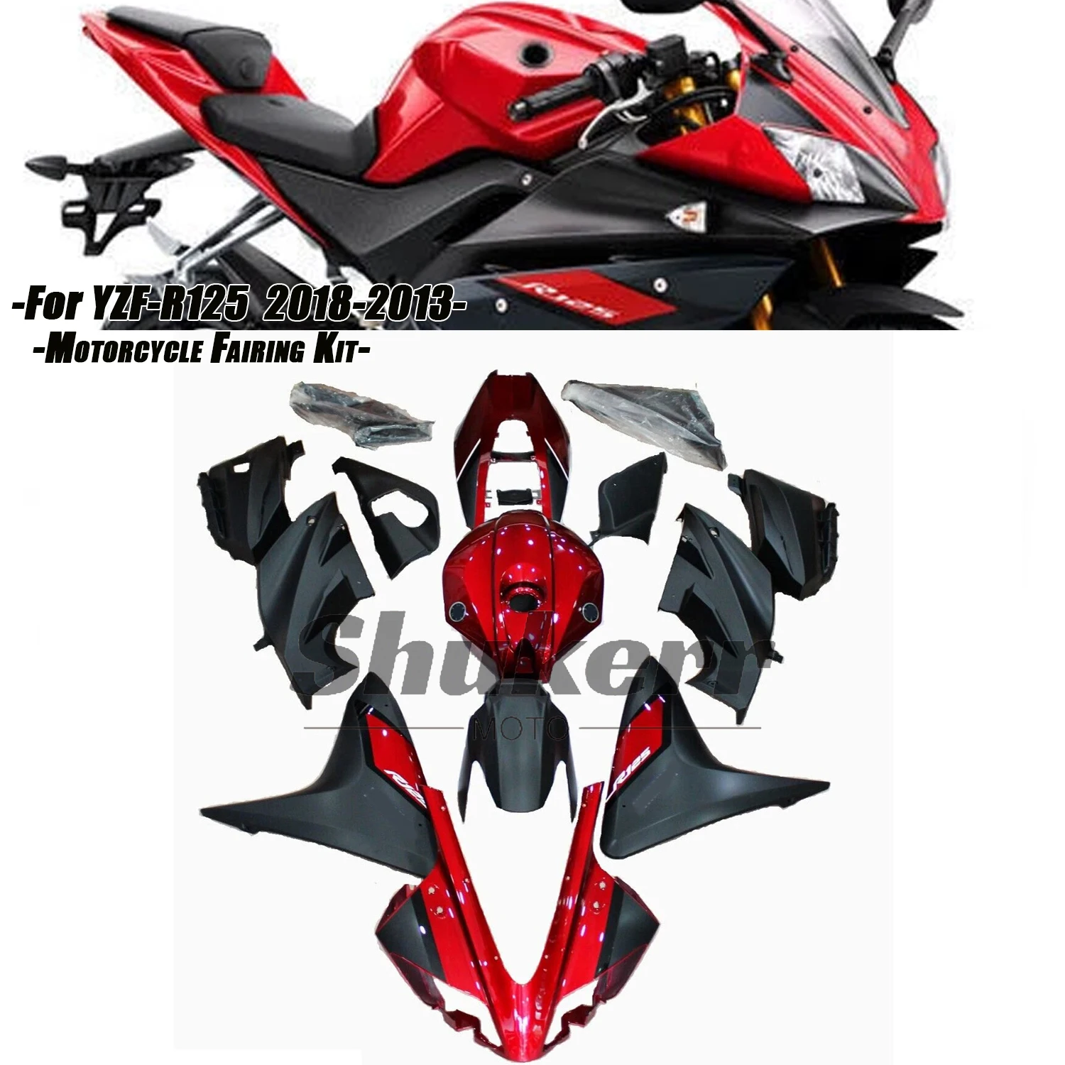 Kit Carene Moto in ABS Nero Rosso per Yamaha YZF-R125 2008-2013, Pannelli Carrozzeria Stampati a Iniezione 09 10