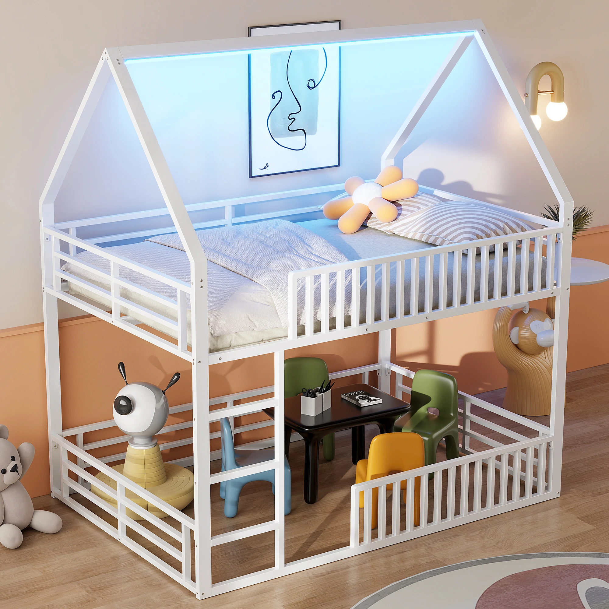 Letto a castello letto per ragazzi 140x200, letto matrimoniale con ringhiera protettiva e sala giochi, con luce LED 7 colori (senza materasso)