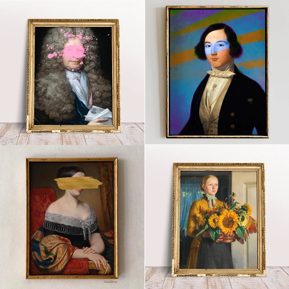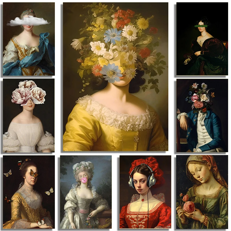 Divertente ritratto vintage alterato stampa arte moderna tela pittura femminile surreale rococò barocco poster galleria decorazione della parete di casa