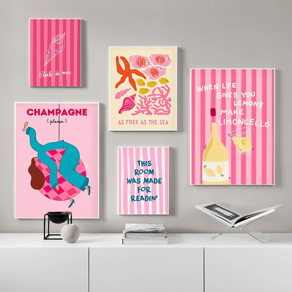 Poster artistico da parete con citazioni divertenti sulle coste italiane, stampe artistiche di cocktail al champagne, poster alla moda rosa corallo per decorazioni da camera da letto e soggiorno