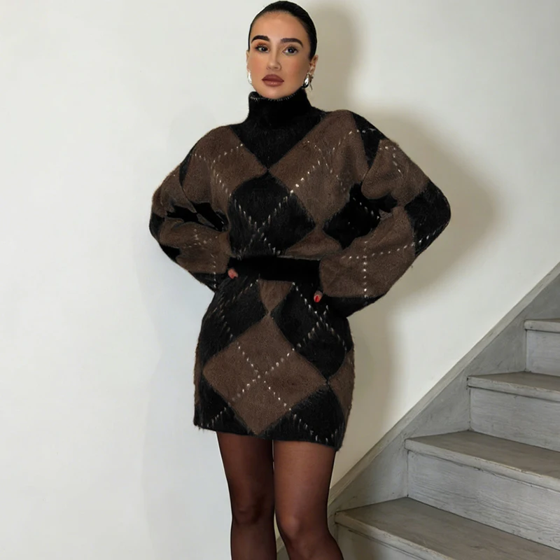 TARUXY Completo Donna con Maglione a Collo Alto e Gonna, Set in Maglia con Stampa a Contrasto, Nuova Moda Autunno Inverno, Outfit Trendy