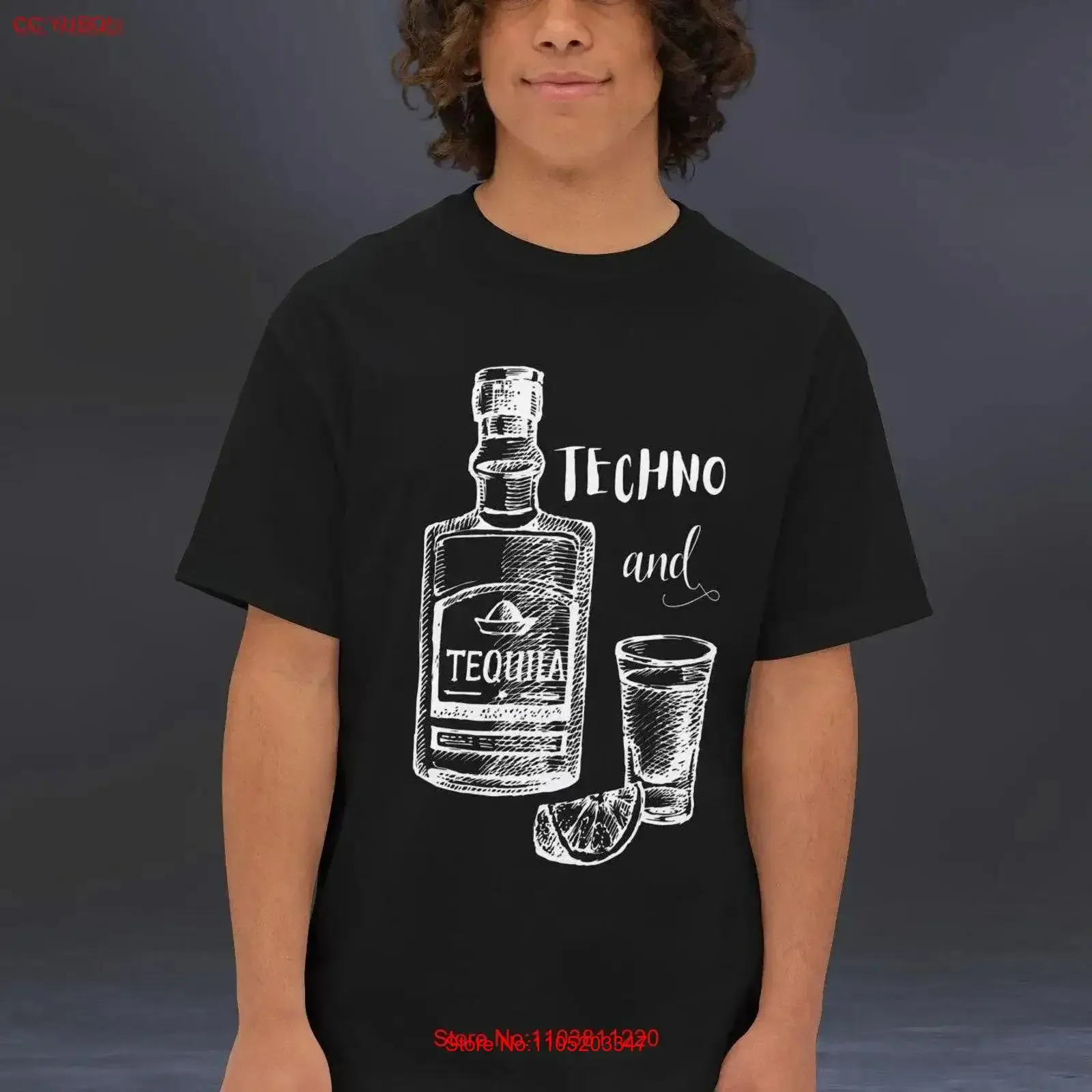 Techno e Tequila T Shirt EDM Rave Abbigliamento Divertente Divertimento Party Vibes Bottiglia Shot Glass Amante vintage Lavato Casual Elegante Morbido