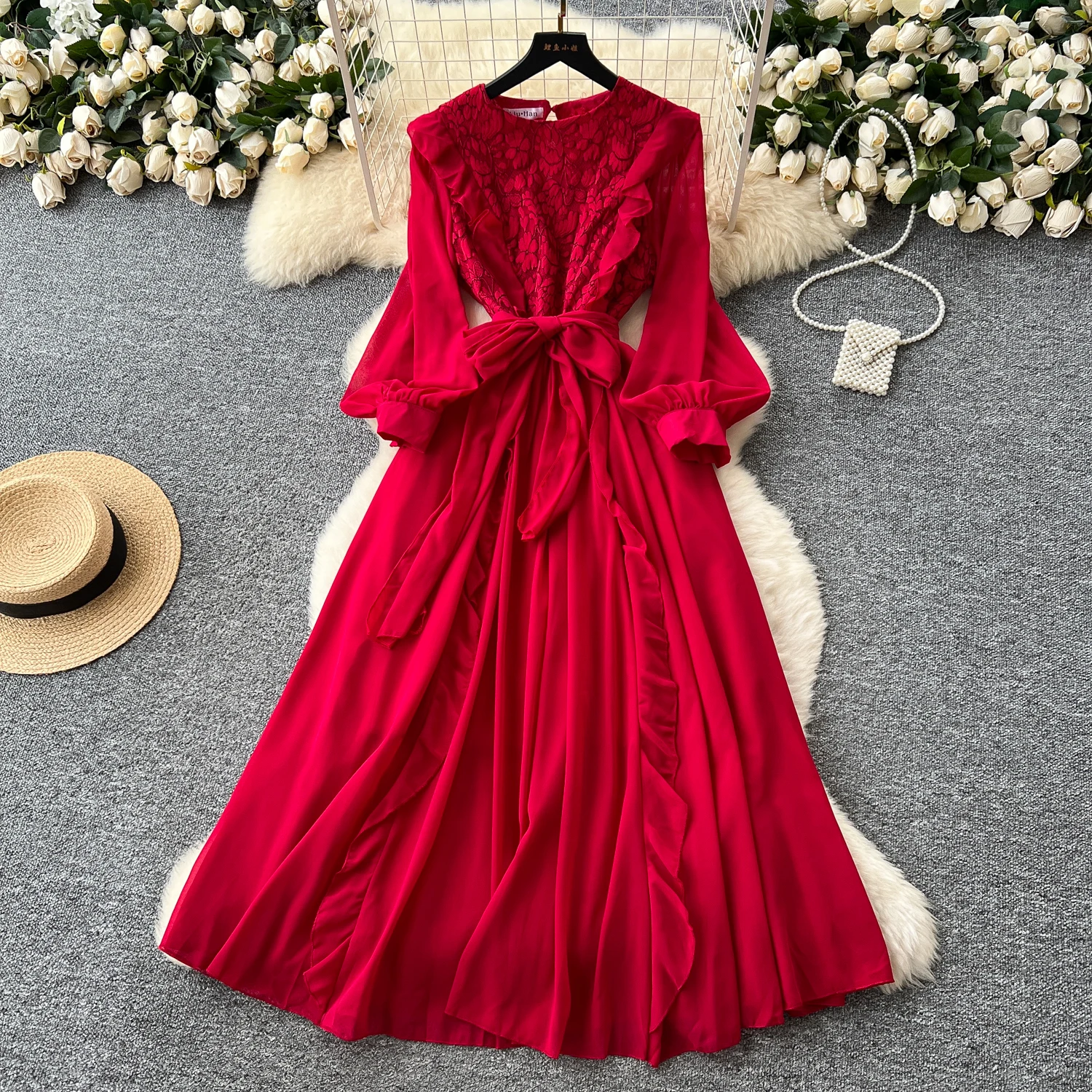 Abito da cerimonia vintage da donna con scollo a V a trapezio in rete di pizzo con lacci increspato chic Abito da sera allentato sexy da donna