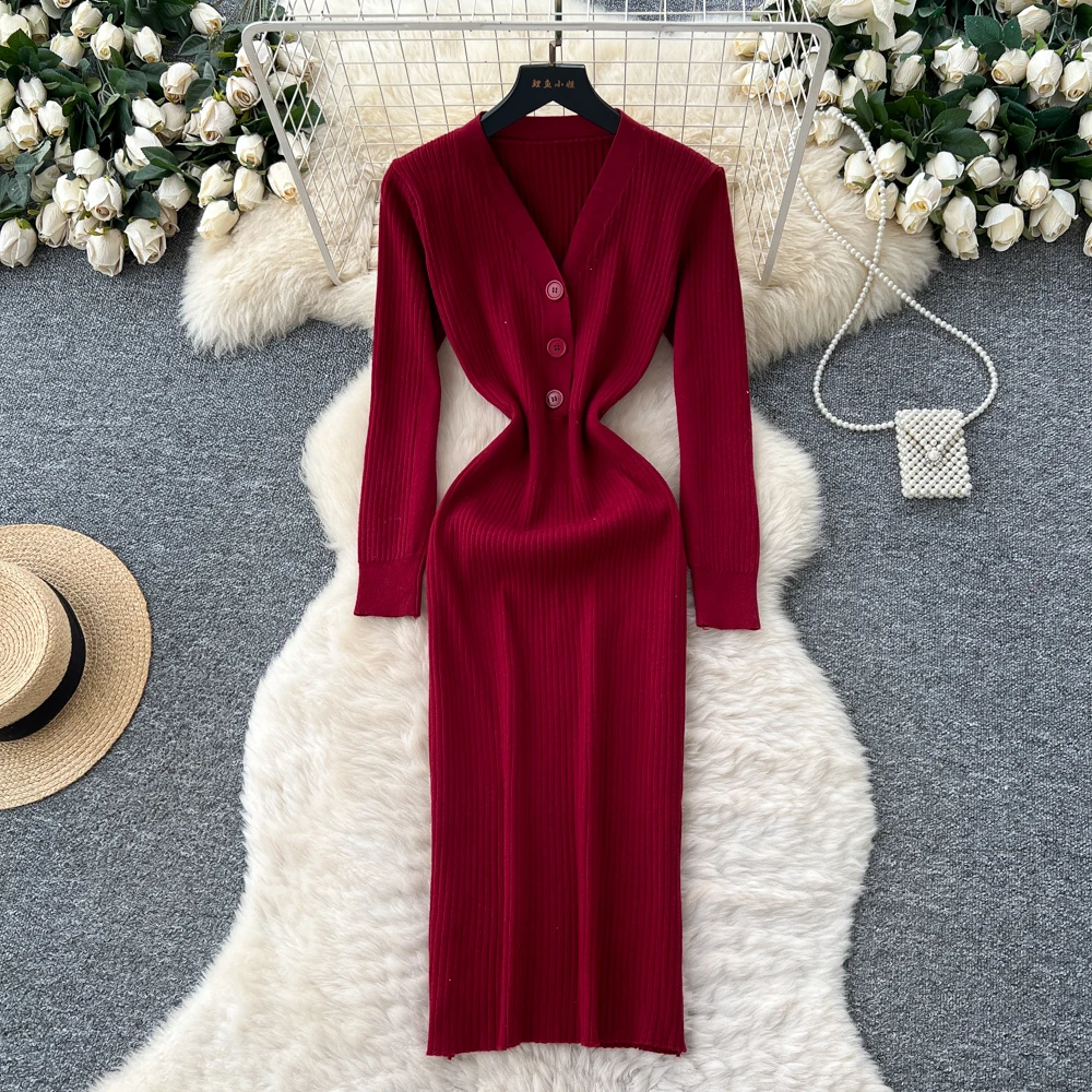 abiti da cerimonia vintage con scollo a V e bottoni a maniche lunghe, impiombati, solidi, moda coreana, abbigliamento da donna