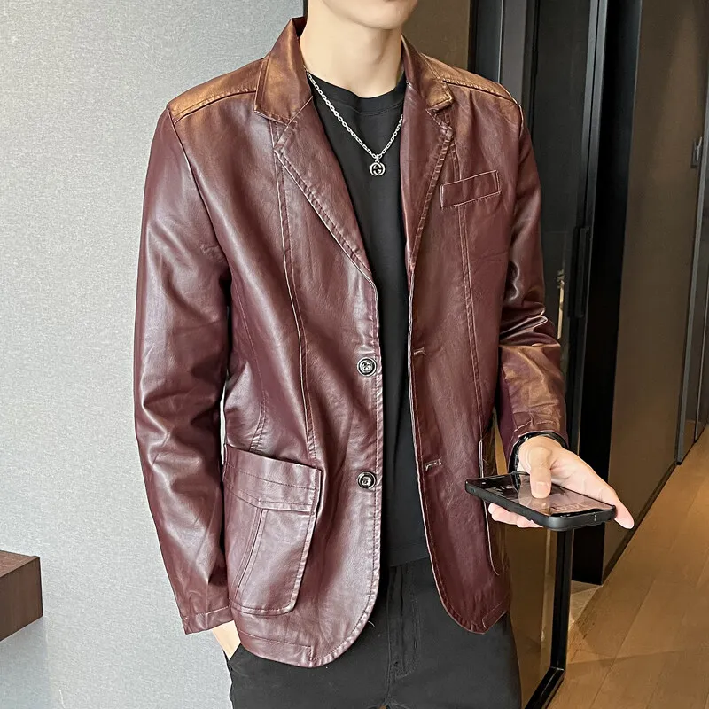 2026 Nuova giacca in PU da uomo kaki, cappotto nero bordeaux blu scuro, blazer in pelle slim taglia asiatica, M-5XL, 2025 Nuovo
