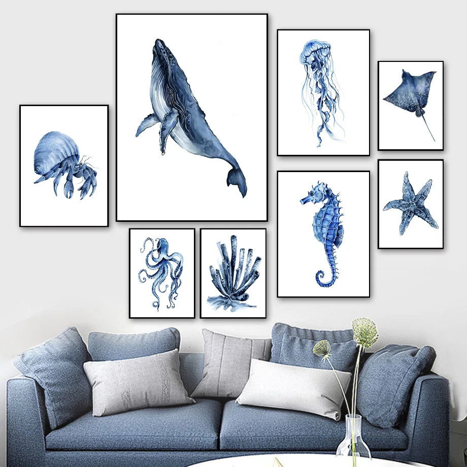 Balena Delfino Granchio Pesce Polpo Cavalluccio marino Corallo Oceano Poster e stampe Pittura su tela Immagini di arte della parete Camera dei bambini Decorazioni per la casa