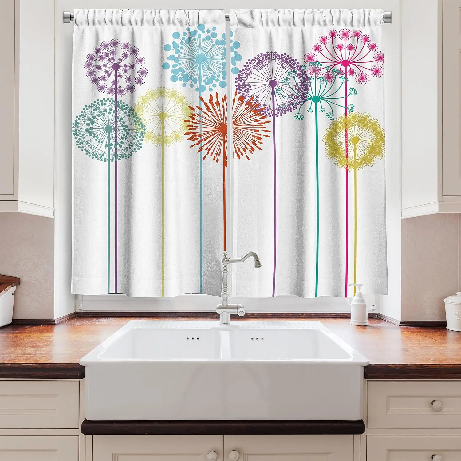 Tende da cucina floreali, opere d'arte ispirate ai fiori, tarassaco colorato su sfondo bianco, stampa di illustrazioni, set di 2 cassetti