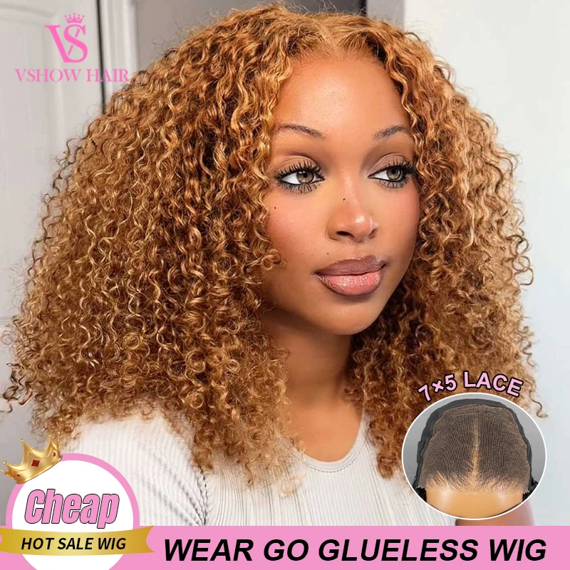 VSHOW Evidenziare Ricci crespi Glueless Wear Go 7x5 Pre Cut HD Parrucca in pizzo 4/27 Ombre Colorato Parrucca anteriore per capelli umani al 100%