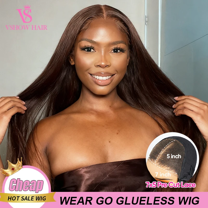 Parrucca senza colla VSHOW 7x5 Lace Front Wear Go prepizzicata color cioccolato # 4 parrucche diritte per capelli umani precolorate pre-tagliate