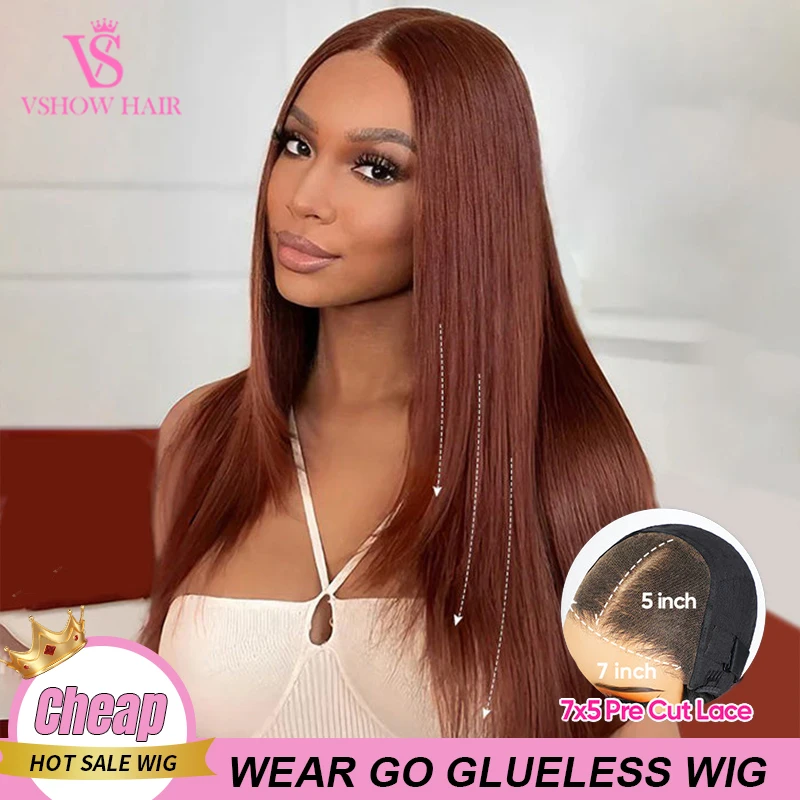 Parrucca Wear and Go 7x5 diritta con taglio a strati VSHOW # 33 Parrucca per capelli umani in pizzo svizzero senza colla pretagliata di colore marrone rossastro