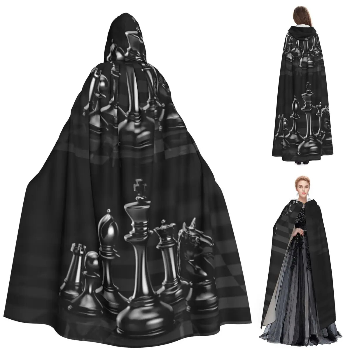 Black King Chess The-chessboard Mantello lungo con cappuccio Strega Costume medievale Mantello cosplay HalloweenVampiro Adulto Unisex