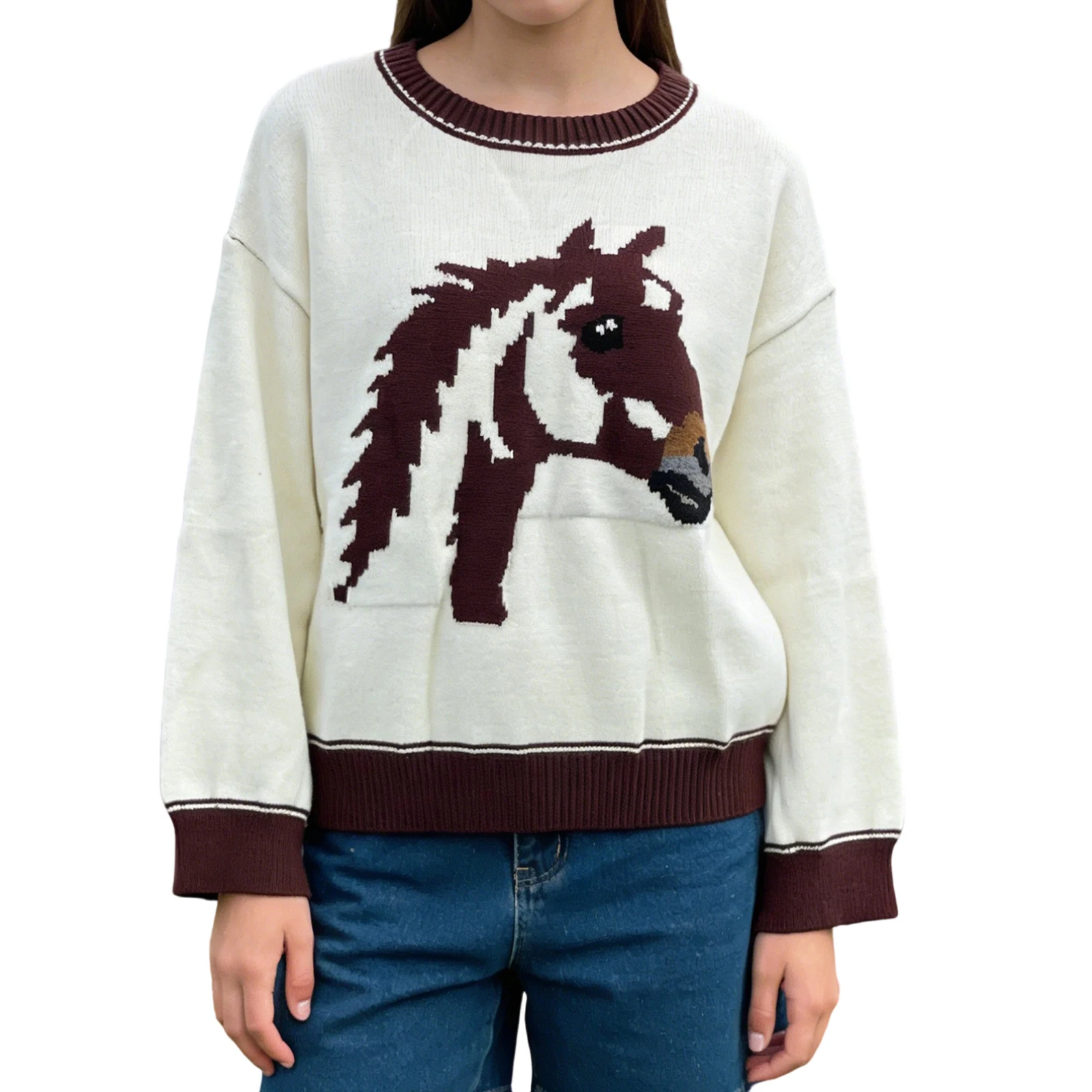 Maglione da Donna Autunno Inverno a Maglia Manica Lunga Collo Tondo con Stampa Testa di Cavallo