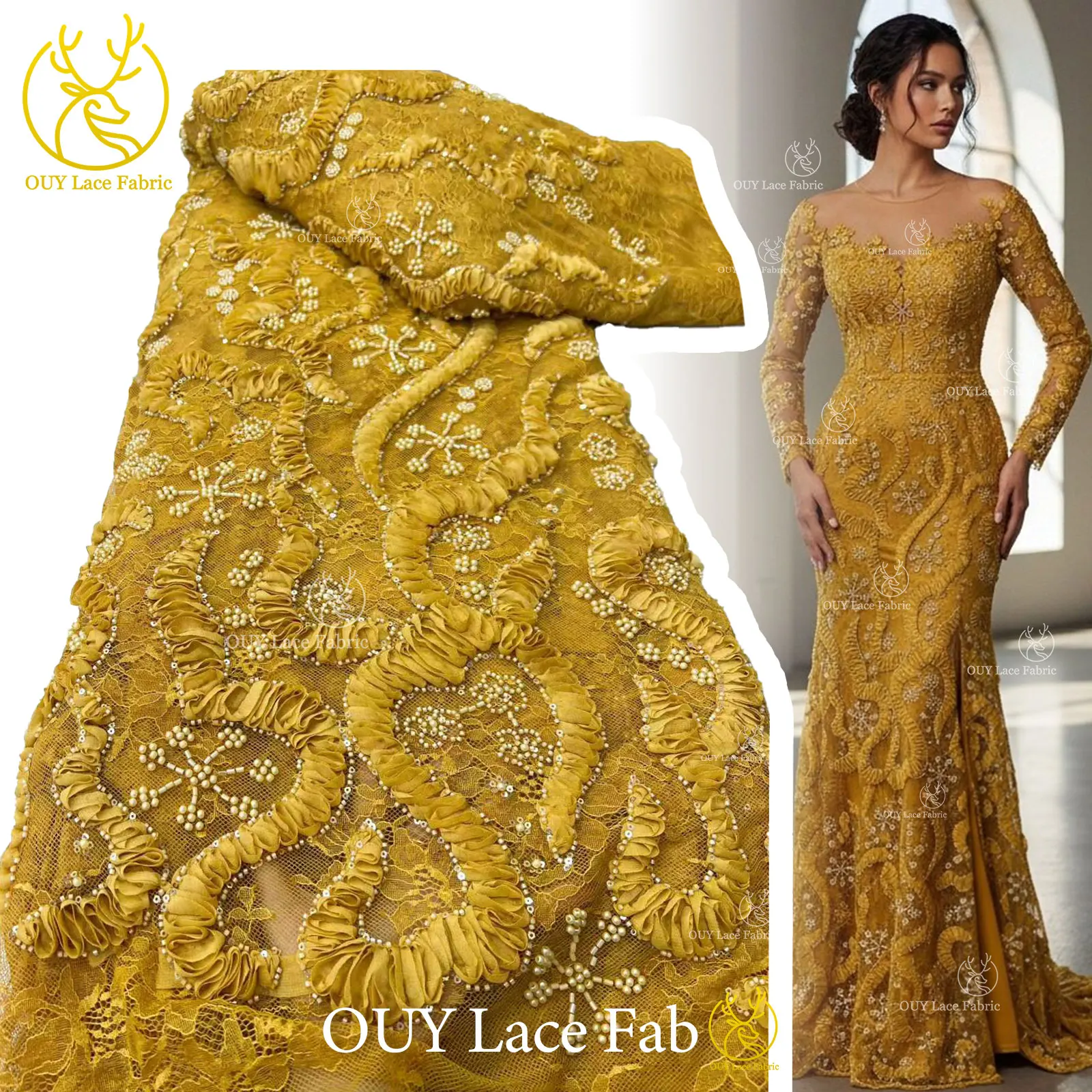 Tessuto fantasia dorato sfumato da 1 metro, organza iridescente tridimensionale effetto laser per abiti da sposa e abbigliamento