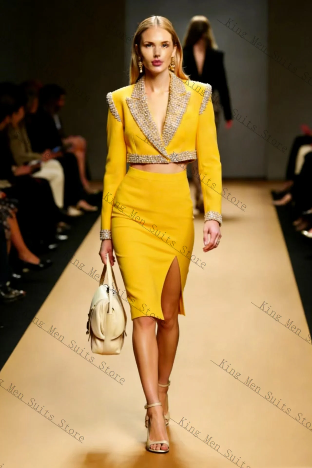 Abito per festa di nozze Personalizza A-Line Scollo quadrato diviso Perline lunghe fino al pavimento Abiti da sera di lusso Cerniera Abiti gialli