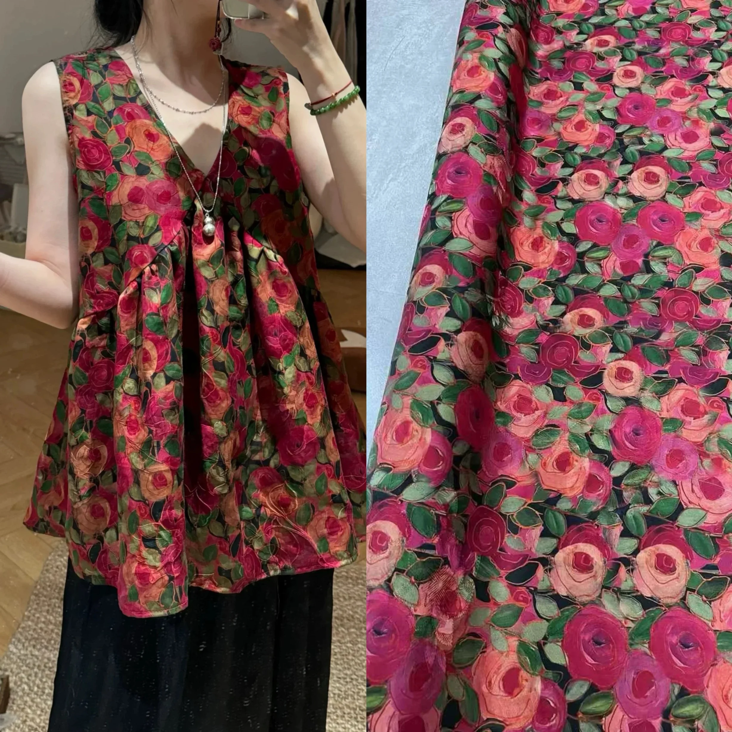 Tessuto di seta pesante stampato con rose romantiche da 25 mm per cucito fai da te, pantaloni estivi primaverili, pigiami, gilet, materiale confortevole R2440