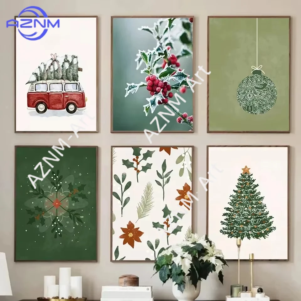 Decorazione Natalizia con Palline per Albero di Natale, Poster con Agrifoglio Invernale su Tela, Stampe di Fiocchi di Neve, Quadro Decorativo per Casa e Stanza