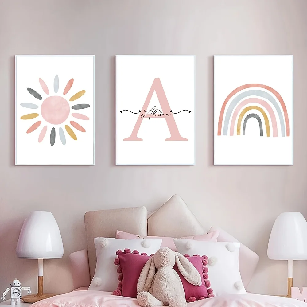 3 pezzi di nome su tela da parete: cartone animato rosa sole, arcobaleno e disegni floreali, stampe estetiche moderne senza cornice per la camera da letto delle ragazze, Nur