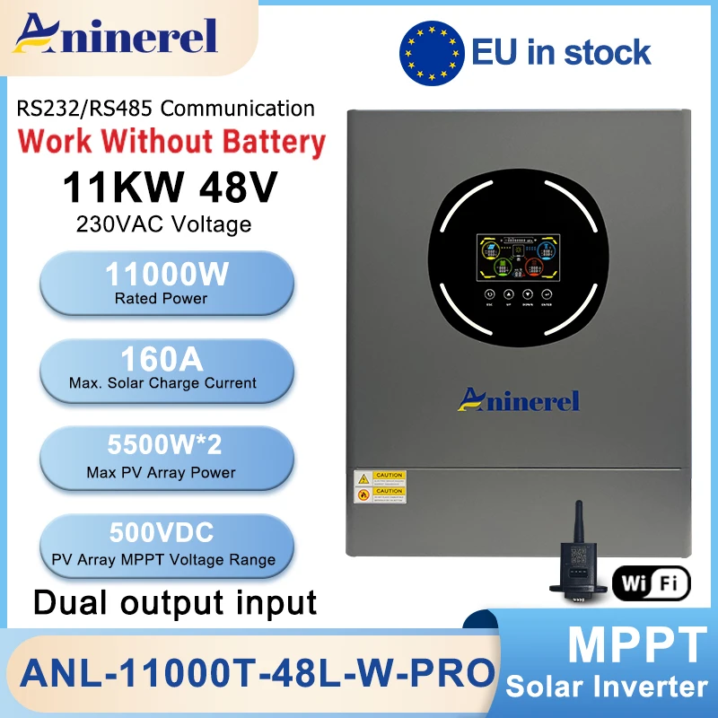 Aninerel 11KW 48V Inverter solare ibrido Doppia uscita Doppia ingresso Regolatore solare Display LCD a colori MPPT 160A PV 500VDC RS232/485