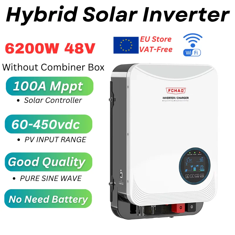 FCHAO 6.2kW Inverter solare ibrido 48V con 100A MPPT, ingresso fotovoltaico 60-500V, onda sinusoidale pura, funzionamento senza batteria, monitoraggio WiFi