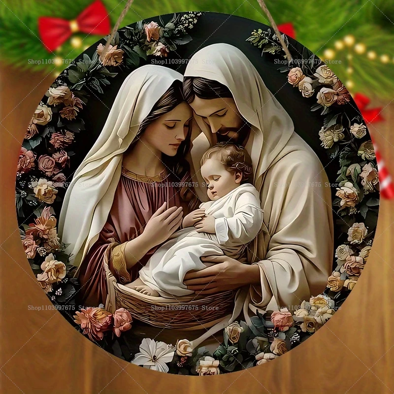 1pc 2D presepe di Gesù cartello in legno perfetto regalo di Natale cartello da appendere in legno rotondo per la decorazione da appendere alla parete della porta d'ingresso della chiesa